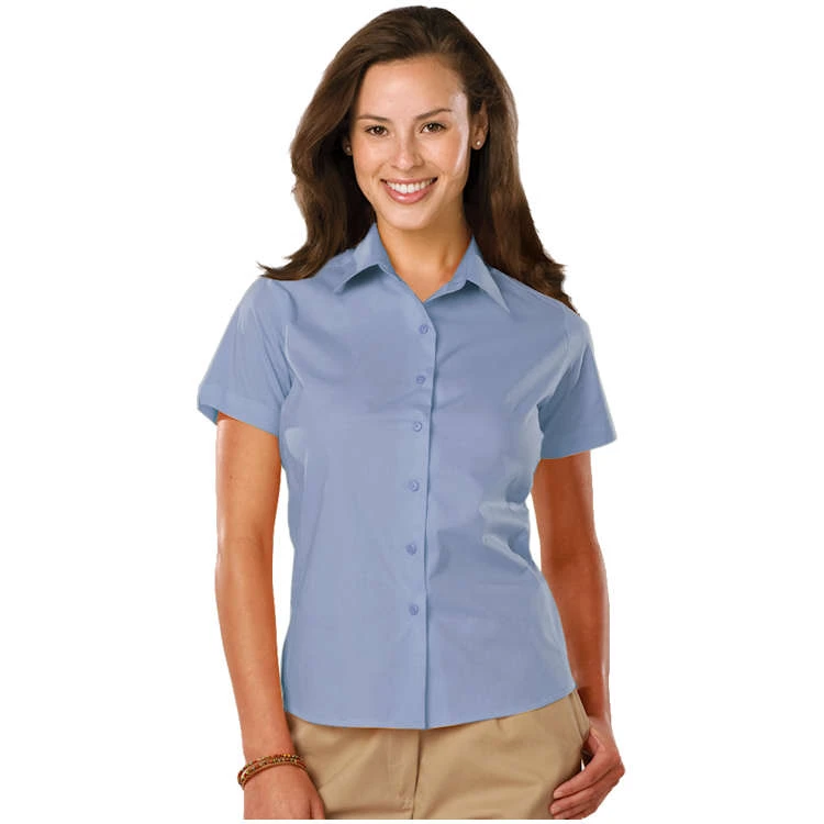 For a bold blouse that will spice up your wardrobe, look no further! Made of a 58% cotton/39% polyester/3% spandex blend, this ladies 4.5 oz. short-sleeve poplin blouse is a bound to turn plenty of heads. It features turn-up cuffs, wrinkle-resistant technology, a spread collar, curbed side panels for a slimmer fitted feminine look, a soft-touch finish, a double-back yoke and pearlized buttons. This stylish shirt won’t go unnoticed!